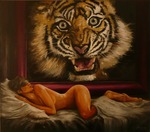 2012Slapende geblinddoekte vrouw, voor een beeld van een tijgerkop.