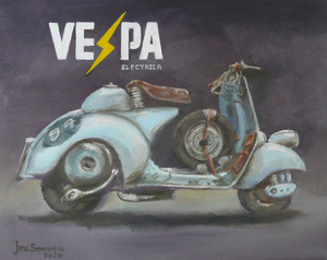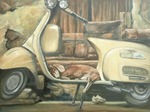 2013Teckel Waltje slaapt op e voetenplank van een Vespa.